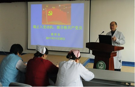 2011年11月28日,本年度入党积极分子培训班开班。来自7个总支的40余名积极分子参加了此次培训。院所党委书记李惠君做开班讲话,并结合院所发展,为广大积极分子提出了具体要求。党委副书记兼纪委书记丑承璋、党委委员、放射科主任蒋世良和纪委委员、急重症中心副主任、HFCU病房主任张健为大家讲授党课,党政办公室副主任吴文斌主持培训并介绍了有关入党的程序和相关要求。