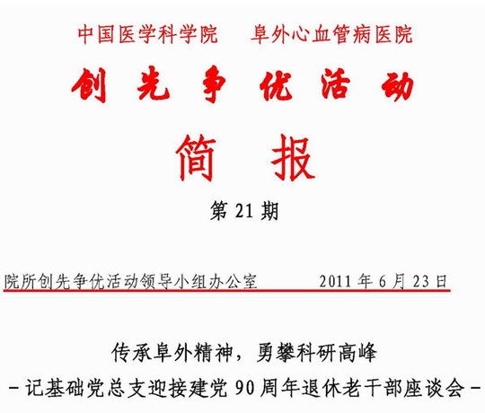 2011年6月22日上午,为庆祝建党90周年,阜外医院基础党总支在我院组织了退休老干部座谈会。院所党委李惠君书记、基础总支各科室主任和党员干部与退休老干部代表欢聚一堂,畅谈过去,共话未来。