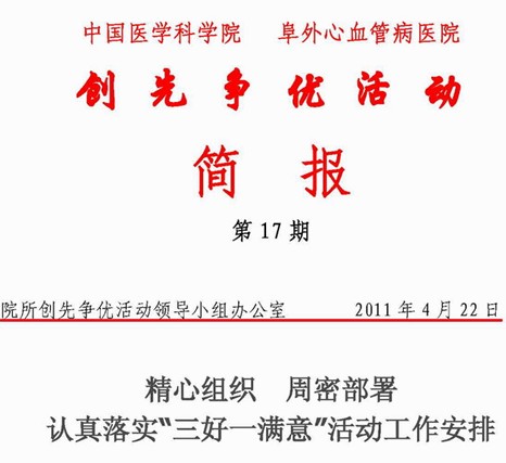 三、于2011年4月18日组织班组长以上人员召开了专题动员会。动员会由院所党委曲永忠书记主持,李惠君副院所长作动员,向大家传达了卫生部开展“三好一满意”活动的重要意义、指导思想、工作目标及需要解决的四个方面问题,营造了良好活动氛围。动员会上,胡盛寿院所长最后再次强调了要提高对开展“三好一满意”活动重要性的认识,要求尽快把相关精神和要求传达到每位职工,并组织召开病房主任会,分解落实目标责任,切实把院所“三好一满意”活动工作方案落到实处。