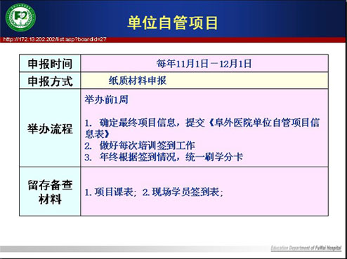 1.开展前一周,由教学助理内网下载项目申请表2份,签到表1份和总结表1份。将申请表填写完整后交于教育处审批(一个项目可开展多个同专业课题),审核合格,按《阜外心血管病医院继续医学教育学分授予办法》授予学分。教育处和科室分别存档相关资料。