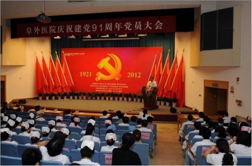 主席台上方,悬挂着“阜外医院庆祝建党91周年党员大会”的横幅。主席台中央,十面鲜艳的红旗簇拥着金色的党徽,在璀璨华灯下熠熠生辉。整个会场气氛庄严而热烈。