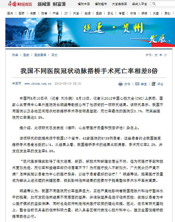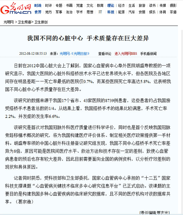 中国网:我国不同医院冠状动脉搭桥手术死亡率相差8倍
