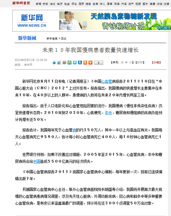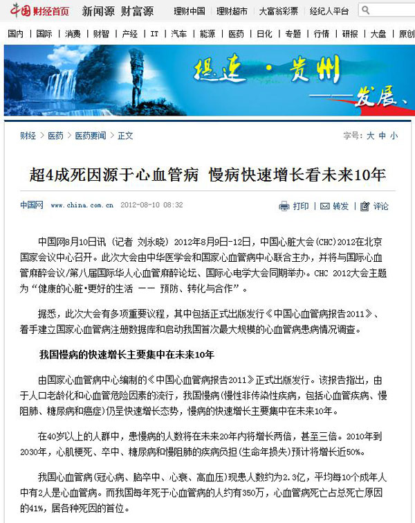 中国网:超4成死因源于心血管病 慢病快速增长看未来10年