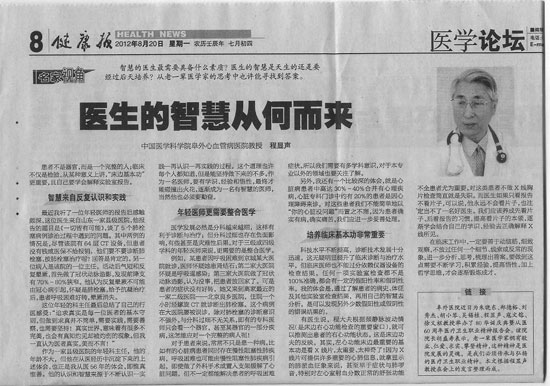阜外医院近日为朱晓东、郑德裕、刘秀杰、胡小琴、吴锡桂、程显声、寇文镕、徐义枢教授举办了80华诞庆典暨从医60周年医疗卫生职业精神报告会。该院院长胡盛寿表示,老一辈医学家拥有敬业、仁爱、求实、攀登精神,这种精神是医院发展的灵魂,是我们必须传承与弘扬的医疗卫生职业精神。本文根据程显声教授在会上的发言整理而成。
