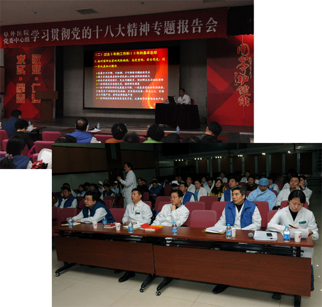 胡盛寿院长在学习会上做了发言。他结合工作实际,就为什么要学习、学习什么内容和如何学习三个问题谈了对学习贯彻十八大精神的一些想法。他强调,学习宣传贯彻党的十八大精神是医院当前和今后一个时期的首要政治任务。作为从事民生工程的医疗服务机构与科学研究机构,认真学习贯彻十八大精神,就要原原本本地学习党的十八大报告、新修订的党章和习近平总书记讲话内容,并在此基础上,发扬理论联系实际的马克思主义学风,坚持学以致用、用以促学的学习方式,围绕着十八大报告中的多处涉及到医药卫生、高等教育、科技体制创新、人才工作等一些的新观点、新论断和新举措,把贯彻十八大精神与医院各项工作结合起来,不断解放思想,尽快把学习成果转化为推动医院科学发展的新思路与新行动。