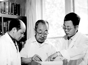 年轻时的朱晓东(右)聆听吴英恺教授指导