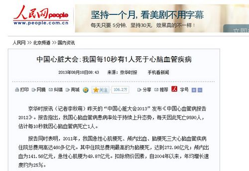 人民网:中国心脏大会:我国每10秒有1人死于心脑血管疾病