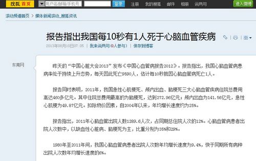 搜狐网:报告指出我国每10秒有1人死于心脑血管疾病