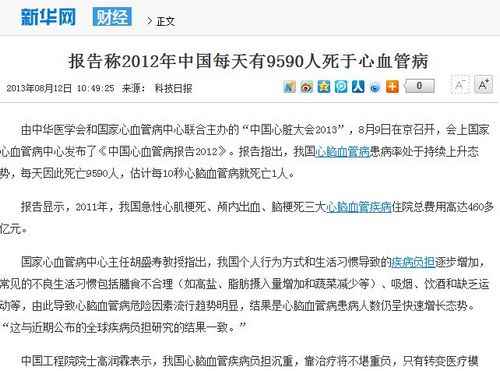 新华网:报告称2012年中国每天有9590人死于心血管病
