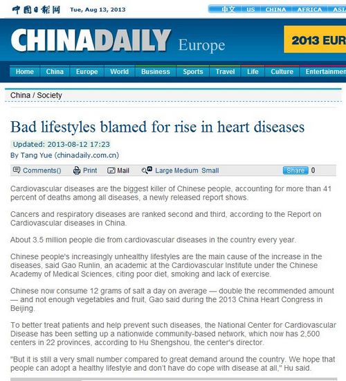 中国日报:Bad lifestyles blamed for rise in heart diseases