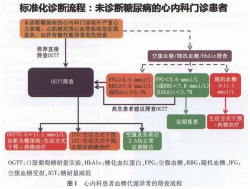 积极筛查是早期干预的前提。因此,在临床工作中,应将血糖检测做为冠心病及其高危人群的常规检查项目之一。由于仅检测空腹血糖将漏诊多数高血糖患者,而口服葡萄糖耐量试验(OGTT)操作较为复杂,考虑到临床实际工作中的可操作性,建议对心内科住院的心血管病患者检测空腹血糖与餐后2h血糖。门诊患者可应用快速血糖检测仪进行筛查。高度怀疑或确诊糖尿病的患者应进一步行正规的OGTT并检测糖化血红蛋白(HbAlc),为确定治疗方案以及疗效监测提供依据,并视具体情况转由糖尿病专家诊治。