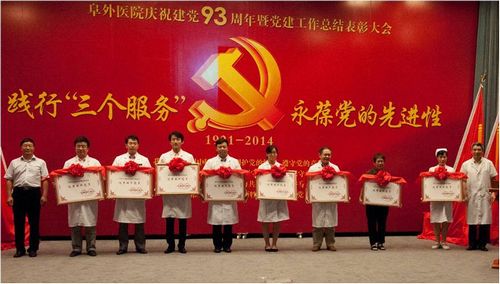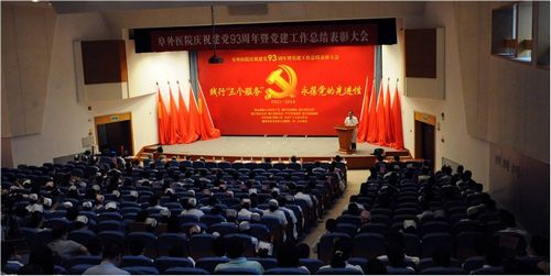 主席台上方悬挂着“阜外医院庆祝建党93周年暨党建工作总结表彰大会”的横幅,十面鲜艳的红旗簇拥着印有金色党徽和大会主题“践行‘三个服务’ 永葆党的先进性”的背景板,在璀璨华灯下熠熠生辉。会议气氛庄严而又热烈。