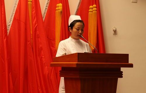 随后,在领誓人党政办公室主任助理陈宣男的带领下,医院2013-2014年度发展的19名新党员进行了庄严的宣誓。神圣的誓词在报告厅内激荡,让我们重温了入党时的坚定信念。随后,新党员代表岳广新在会上发言。她代表全体新党员对党组织的教育与培养致以了最真诚的感谢和最崇高的敬意。她在发言中提到,当组织与她谈话时问她为什么入党,她就自然地想起了身边优秀的共产党员。他们,全心为患者服务,不问贤愚贵贱;潜心向医,不为流俗所变;不慕虚荣,不攀权贵。他们的精神正是“全心全意为人民服务”的宗旨体现,也正是这坚定了她一心加入党组织的决心。随后,她代表全体新党员向党做出了庄重的誓言,作为新党员和医务工作者,他们将怀着对医学事业神圣的自豪感和责任感,做医学领域的行家能手,以高质量的医疗水平服务于患者。