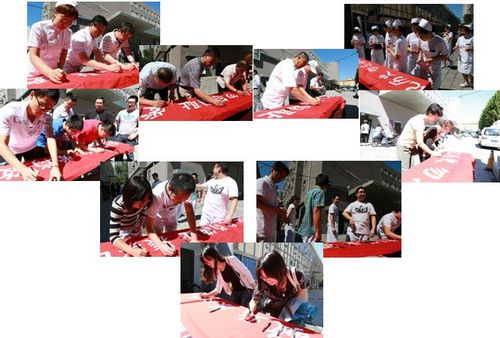 前事不忘后事之师。今年是中国人民抗日战争胜利69周年暨世界反法西斯战争胜利69周年,为纪念这一正义战胜邪恶、光明战胜黑暗、进步战胜反动的伟大胜利,弘扬革命先辈的光荣传统,进一步凝聚民族力量,增强民族自尊心、自信心和自豪感,医院党委、工会、团委于9月3日联合开展了宣扬爱国主义精神纪念抗战胜利69周年签字活动。为了在不影响临床工作的前提下让更多的职工群众参与此次活动,活动时间定于中午11点到12点,将人员最为集中的本部科研楼大厅和北楼留影墙作为签字现场。