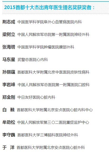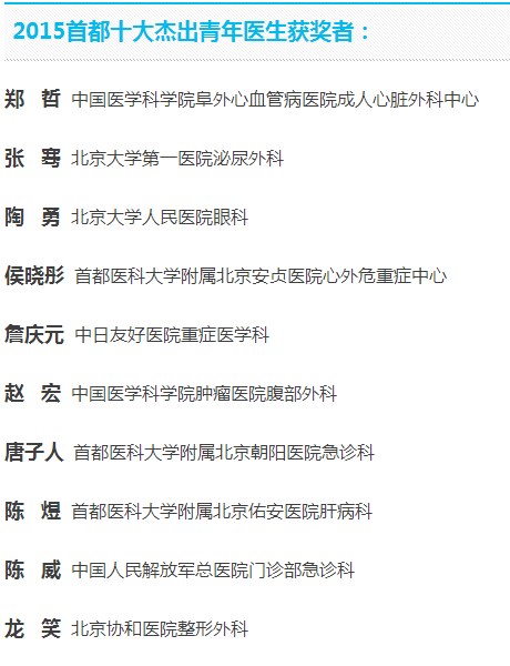 为了鼓励首都地区青年医生群体的成长、成才,促进青年医生的专业交流,提升其专业及整体素质,由人民网、中国青年报社、中国科学报社、医学科学报社共同主办的“2015首都十大杰出青年医生评选”活动于今年4月份正式启动,此次评选活动吸引了首都地区近百家医院、数千名医生的参与。