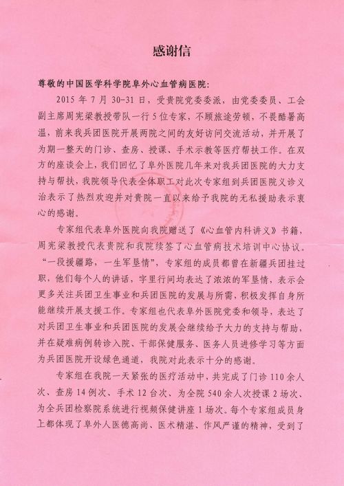 在这次医疗活动中,开展了专家义诊、查房、讲课、手术等形式的工作:医疗队门诊义诊160余人次,查房疑难危重患者病人12人,开展心脏介入手术9例;举办了专题讲座,给兵团医院全院范围内进行学术讲座,《猝死的急救-心肺复苏》、《急性肺栓塞的诊断和处理》;在全兵团检察院系统通过电视电话形式为基层干警们讲授《心血管疾病的预防保健知识》。此外,还举行了赠书仪式,给兵团医院赠送了我院专家编写的《心血管内科学讲义》。本次活动得到兵团卫生局和兵团医院的高度重视和热烈欢迎,义诊活动取得了圆满成功,受到当地医院和患者的一致好评。正在兵团医院援疆的刘亚欣副教授也参加了此次义诊活动,为活动的顺利开展做了大量工作。本次活动增进了阜外医院和新疆兵团医院的友谊和交流,架起了国家心血管病中心和边疆各族群众之间的爱心桥梁。