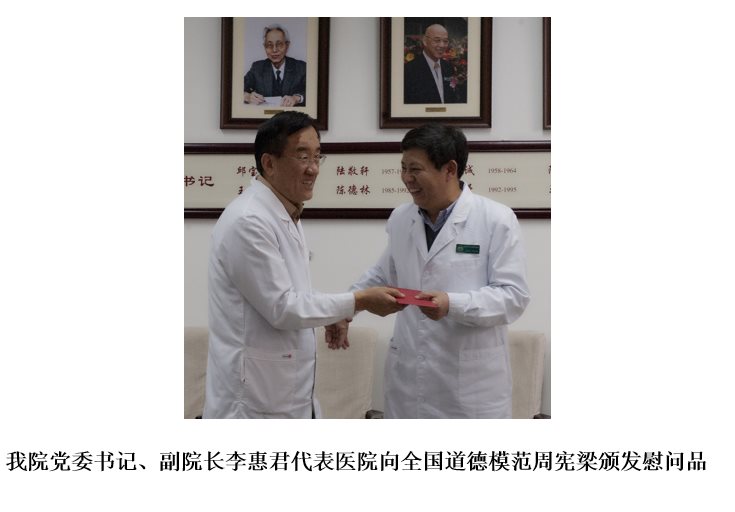 周宪梁同志首先对上级领导的关心和慰问表示衷心感谢。他说,自己是一名普通的医务工作者,是阜外医院提供给他广阔的空间和平台,在为患者服务的过程中他切实的感受到:“‘把病人当亲人’还不够,要把病人当自己。”当他看到患者因得到救治而使家庭得以幸福团圆时,感到无比的高兴。他表示将继续在平凡的岗位做平凡的事情,为实现中国梦、阜外梦、健康梦做出自己的贡献。