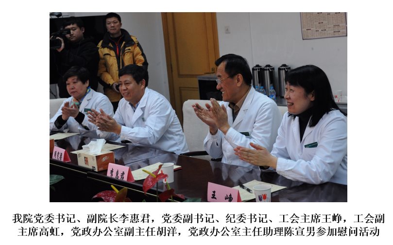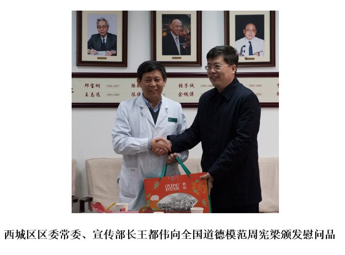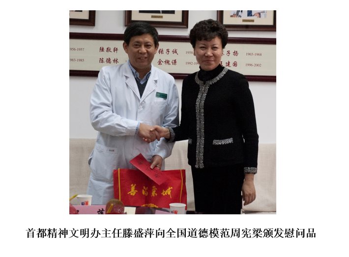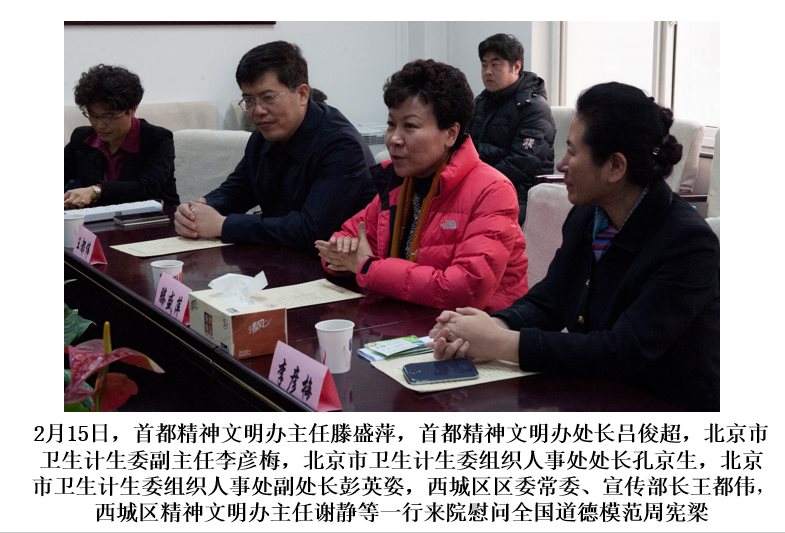 2015年2月15日,首都精神文明办主任滕盛萍、处长吕俊超在北京市卫生计生委副主任李彦梅,西城区区委常委、宣传部长王都伟等领导的陪同下,来我院亲切看望 “全国道德模范”周宪梁同志。医院党委书记、副院长李惠君,党委副书记、纪委书记、工会主席王峥,党政办公室副主任胡洋,工会副主席高虹和党政办公室主任助理陈宣男出席了慰问活动。
