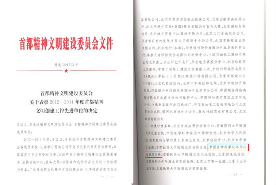 我院在2011年、2012年、2013年连续三年获得“首都文明单位”,2014年年底医院提交申报材料,我院再次荣获卫生计生系统“2012-2014年度首都文明单位标兵”称号。