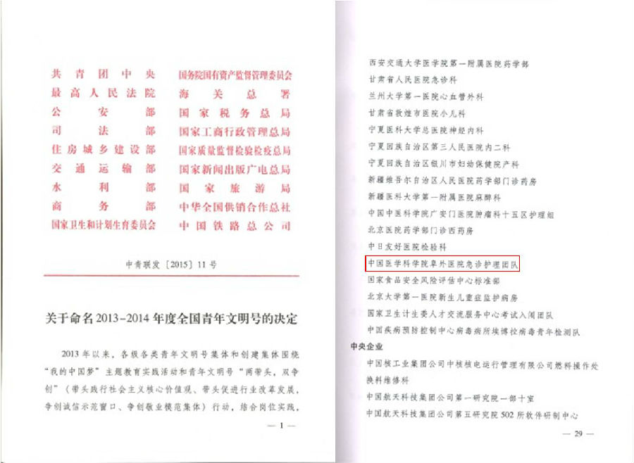 我院急诊护理组在2014年6月荣获“2013-2014年度中央国家机关青年文明号”的前提下,提交申报材料,再次被评为卫生计生系统“2013-2014年度全国青年文明号”。