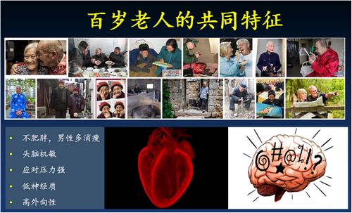 图4展示的是百岁老人的共同的特征,这些老人的共同特征是:一般都不肥胖,脑子非常机敏,而且应对压力的能力是很强的,另外这些老人更加外向性一些。核心的问题,百岁老人的特征,就是他们都有强健的心脏和健全的大脑,这个是十分重要的。