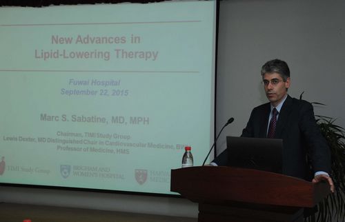会面后,Sabatine教授在杨跃进副院长、介入中心徐波主任的陪同下参观了介入中心、CCU、ICU、十一病房,对我院忙碌而高质量的临床工作留下了深刻印象,并表示希望进一步加强临床研究合作。参观结束后,中国急性心肌梗死注册登记课题组人员进行了课题汇报,Sabatine教授认真听取了课题分析结果,给予仔细点评和指导。会后,Sabatine教授向全院医生及研究人员做了题为“降脂治疗最新前沿”和“冠心病抗血小板治疗最新进展”的学术报告。作为最新PEAGUSAS和OSLER研究的全球总PI,Sabatine教授报告从PCSK-9分子基础研究、PCSK-9抑制剂药物研发和临床试验、抗血小板治疗研究历程和进展进行深入剖析。参会者从中对创新思路受益匪浅,对转化医学和精准医学的飞速发展备受震撼和鼓舞,领略了国际心血管药物研究的精髓,报告后双方进行了热烈讨论。