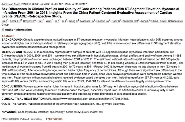 2016年2月22日,美国心脏病协会杂志Journal of American Heart Association (JAHA)在线发表了由国家卫生计生委“2012-2014年度卫生公益性行业科研专项”支持、国家心血管病中心 中国医学科学院阜外医院牵头组织实施的“冠心病医疗结果评价和临床转化研究(China Patient-centered Evaluative Assessment of Cardiac Events, China PEACE)”一项研究结果,该研究显示,2001-2011年间,我国急性ST段抬高性心肌梗死(STEMI)患者中,女性较男性较少接受再灌注等指南明确推荐的可改善预后的治疗措施,且十年无改善。