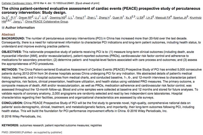 2016年3月4日,国际同行评议杂志Catheterizationand Cardiovascular Interventions在线发表了由国家卫生计生委“2012-2014年度卫生公益性行业科研专项”支持、国家心血管病中心 中国医学科学院阜外医院牵头组织实施的“冠心病医疗结果评价和临床转化研究(China Patient-centered Evaluative Assessment of Cardiac Events, China PEACE)”中前瞻性冠脉造影和介入治疗(coronary catheterization and percutaneous coronary intervention, CathPCI)研究的方法学文章。文章详细阐述了研究的设计、目的、实施以及现实意义。