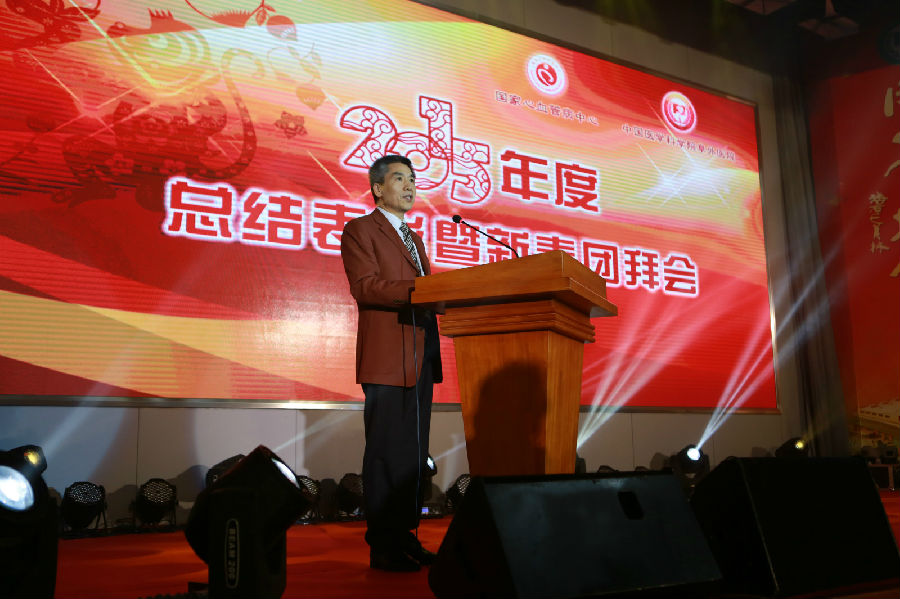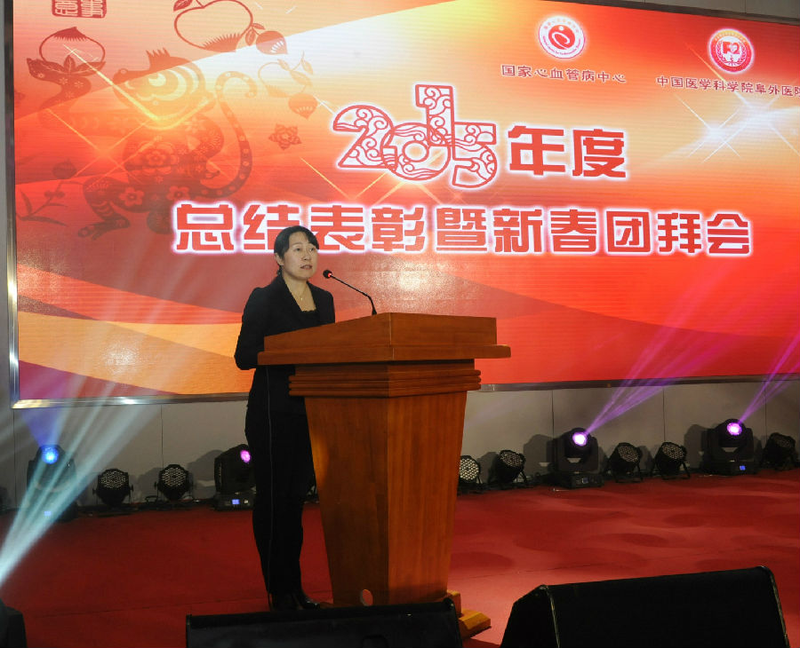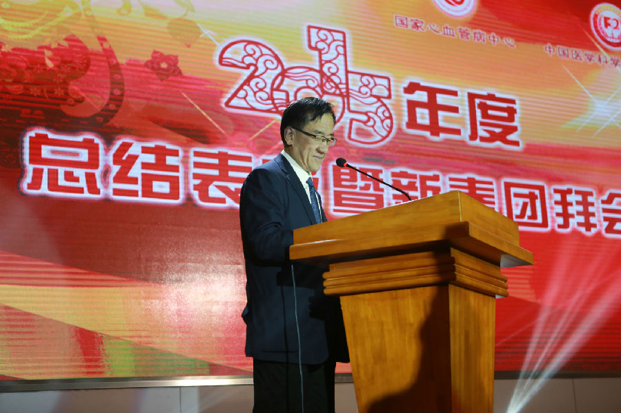国家心血管病中心主任、医科院阜外医院院长胡盛寿同志做精彩致辞。他说,2015年在国家卫生计生委和医科院的领导下,中心和医院在医、教、研、防、管各个方面都取得了可喜成绩,特别是几代“阜外人”共同期盼的新大楼正式投入使用,西山科研基地也开始发挥应有作用,令人欣喜鼓舞。国家卫生计生委领导先后视察中心和医院工作,对医院“由单纯性医疗中心向临床医学研究中心转变”的发展方向予以了充分肯定。他强调,成绩的取得源自全体职工的辛勤付出,他代表中心和医院领导班子成员,向所有“阜外”同仁致以衷心的感谢和诚挚的祝福。