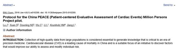 2015年1月4日,《BMJ Open》杂志在线发表了由国家卫生与计划生育委员会疾病预防控制局牵头、国家心血管病中心 中国医学科学院阜外医院组织实施的一项全国性心血管病筛查项目——China PEACE 百万人群项目(China PEACE Millions Persons Project)的方法学文章。该文章详细阐述了本项目的总体目的、试点工作的设计、实施以及初步分析结果。