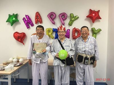 三位接受人工心脏植入的患者为其中最年轻的一位过生日(其中最左侧的患者已经完成心脏移植)