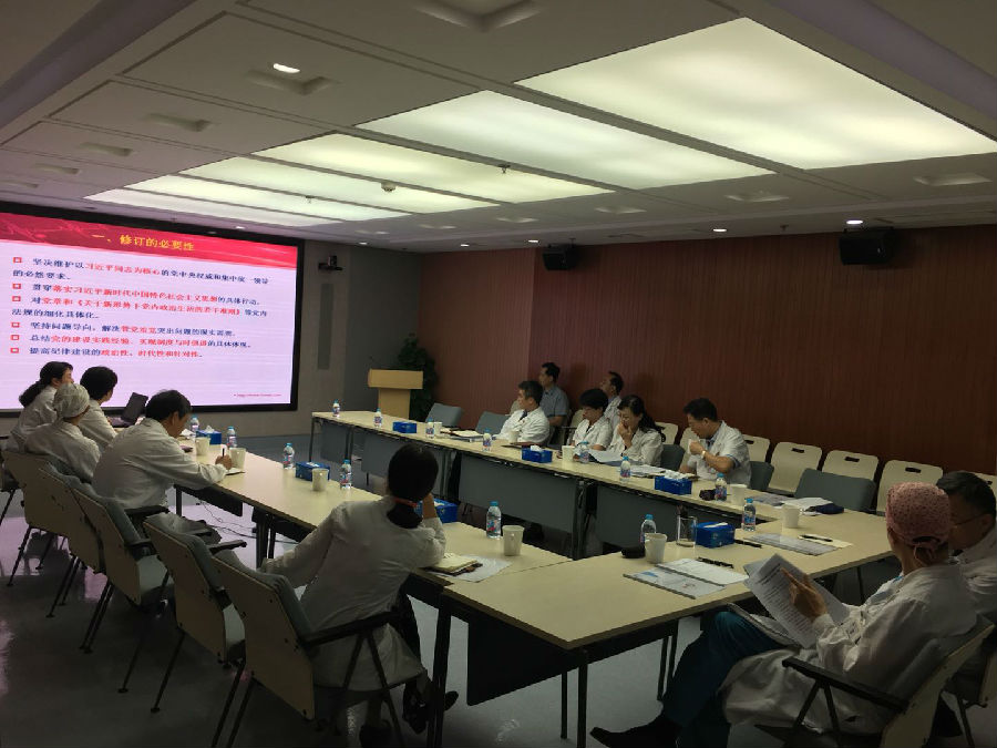 基层党员职工“广泛学”。为更好的让每一个党员参与到《条例》的学习中,9月1--30日,王峥书记亲自带队,纪检监察处联合党委办公室深入临床一线和职能科室党支部,对基层党组织书记、机关后勤党总支全体党员、内科四支部全体党员、成人中心一支部全体党员、放射科支部全体党员、麻醉科支部全体党员、离退休总支全体党员开展《条例》学习的宣讲活动。王峥书记深入的解读《条例》,并从《条例》修订的内容、条例的意义及要求、规定的“高压线”等方面进行了宣讲,重点解读了一个思想、两个坚决维护、三个重点、四个意识四种形态、五处纪法衔接、六个从严、七个有之、八种典型违纪行为等八个亮点。