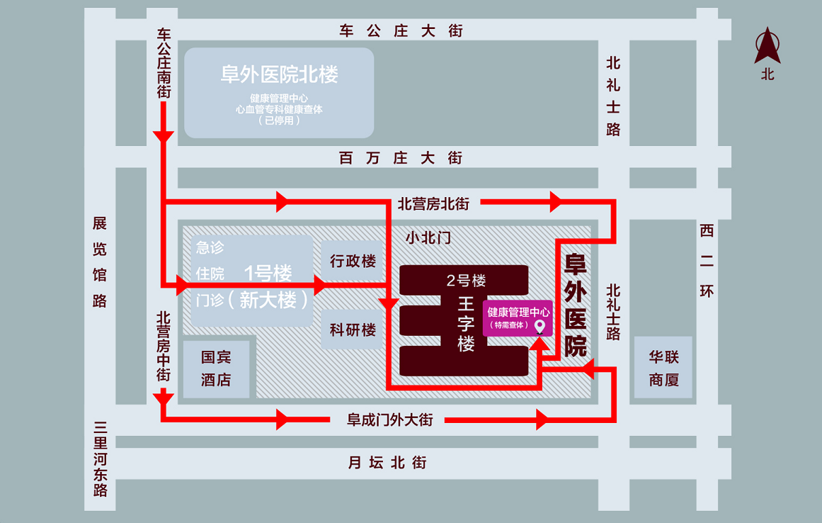 您可选择由医院东南门进入院区,赴健康管理中心(心血管专科特需体检)更为便捷。