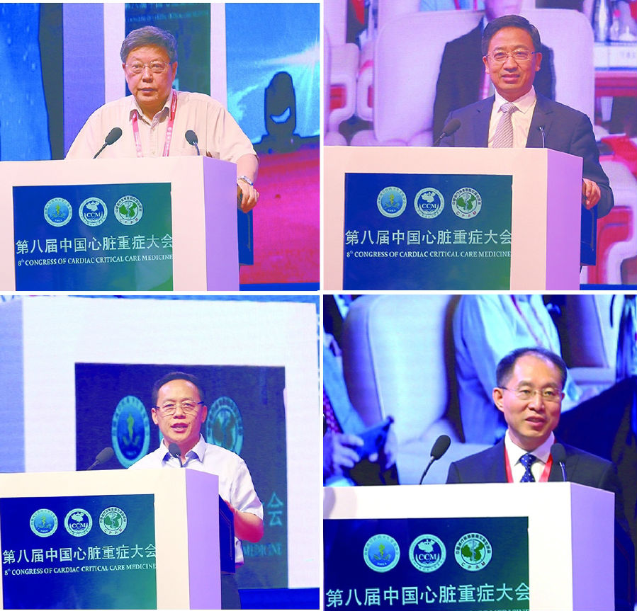 中国医疗保健国际交流促进会常务副会长吕兆丰(左上)、河南省人民医院党委书记顾建钦(右上)、河南省医学会秘书长王伟(左下)、大会主席、中国医学科学院阜外医院术后恢复中心主任张海涛(右下)为大会致辞