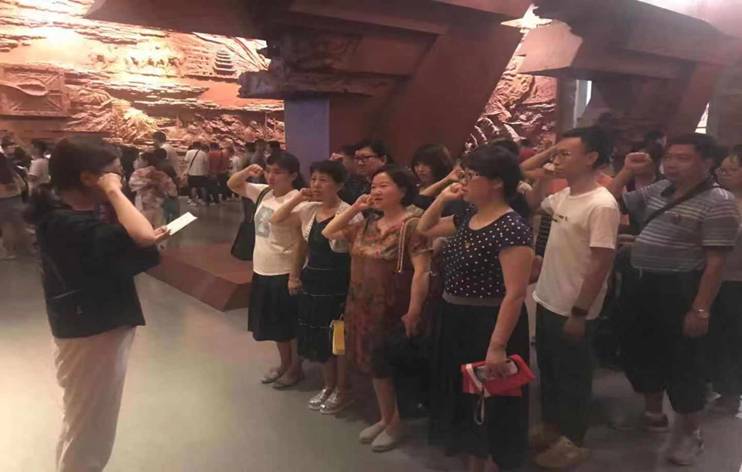 参观展览后,在支部书记的领誓下,党员们面向鲜红的党旗重温入党誓词,“为共产主义奋斗终身”的坚定誓言回荡在展览大厅。