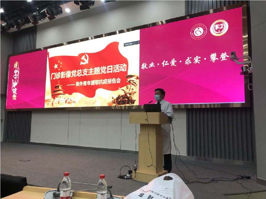 2020年5月14日,门诊影像党总支开展主题党日活动暨阜外青年援鄂抗疫报告会。邀请医科院援鄂抗疫医疗检测队队员、实验诊断中心青年陈前龙和驻云南分院援鄂医疗队队员、冠心病二病区护士长春语诗分享一线战“疫”历程。医院院长助理、内科管委会主任唐熠达,党委办公室主任胡洋,护理部主任郝云霞出席此次活动。