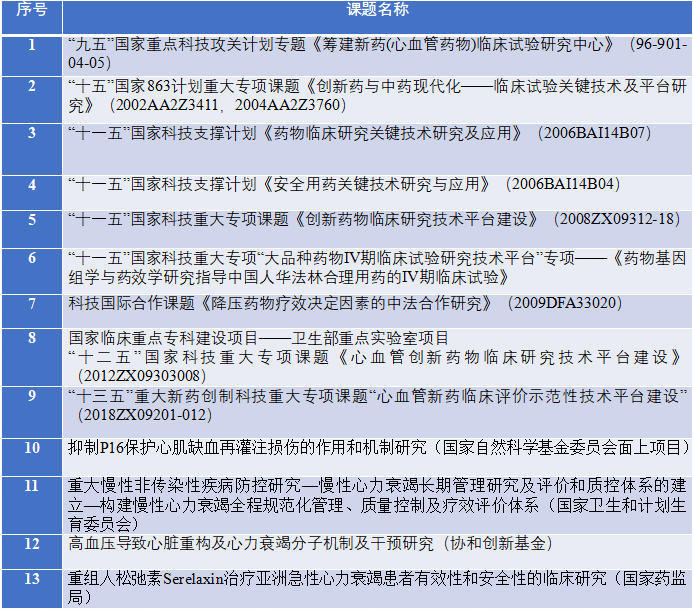 重点实验室“九五”至“十三五”期间承担国家重点科技攻关计划专题、国家科技支撑计划、国家科技重大专项课题、科技国际合作课题、重大新药创制等课题、期间根据国际GCP规范及我国法律法规,整合心血管疾病临床诊治、药物评价技术、实验室分析等多学科技术力量,创建了药物人体临床研究评价技术平台,规范完成各类心血管病新药I-IV期临床试验300多项,协助多家药品研发及生产企业完成新药注册申报工作,成为我国药物临床试验实施GCP的示范基地之一。。