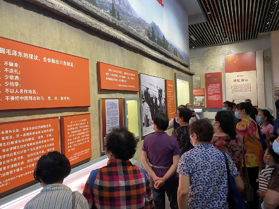 随后大家来到纪念馆内部参观,在讲解员的带领下边走边学,香山纪念馆的主题展览由进京“赶考”、进驻香山、继续指挥解放全中国、新中国筹建和不忘初心牢记使命、永远奋斗五个部分组成,展出了800多张图片、地图、表格和1200多件实物、文献和档案,将新中国成立前夕这段伟大的历史时刻生动再现。老党员们认真的观看、聆听和学习。