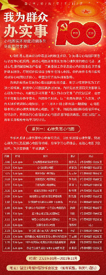 此次心电图系列讲座包含各种缓慢心律失常心电图、各种快速心律失常心电图,不同起搏心电图等。各位授课党员精心准备,结合心电图临床实例,将深入浅出地讲解心电概念、总结心电图识别技巧、分享学习心得体会。本次系列讲座将持续开展至11月30日,具体时间安排如下: